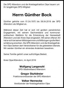 Die SPD trauert um ihr langjähriges Mitglied Günther Bock